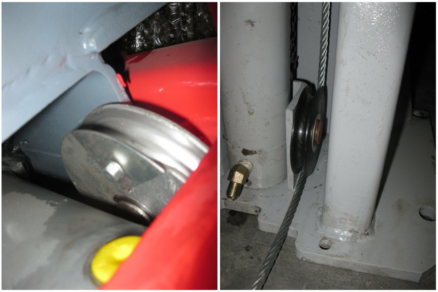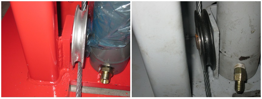 4. Ролик по которому ходит трос у подъемников LAUNCH имеют защиту от случайного слета троса, китайские аналоги защиты не имеют. Это крайне важный фактор для безопасной работы персонала. Соскакивание троса со своего рабочего ролика может привести к падению автомобиля с подъемника при не умелых действиях.